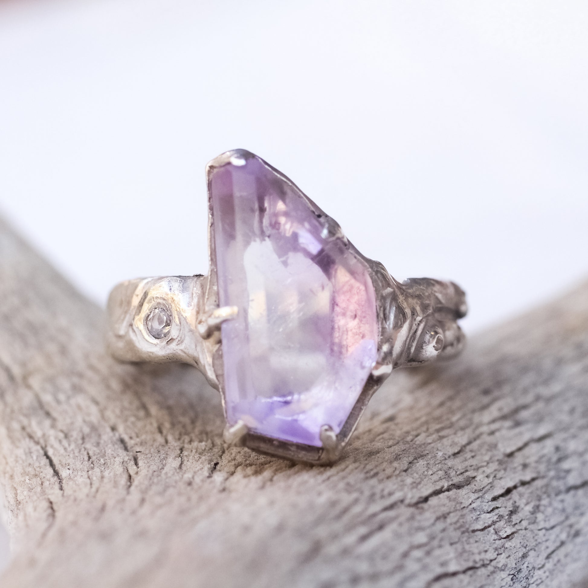 Locally mined and hand faceted Amethyst from the Eastern Sierras, Ca , if you catch the light from just the right angle, this piece illuminates a rainbow inclusion. Paired with faceted topaz details on the band. Hand carved and cast in silver