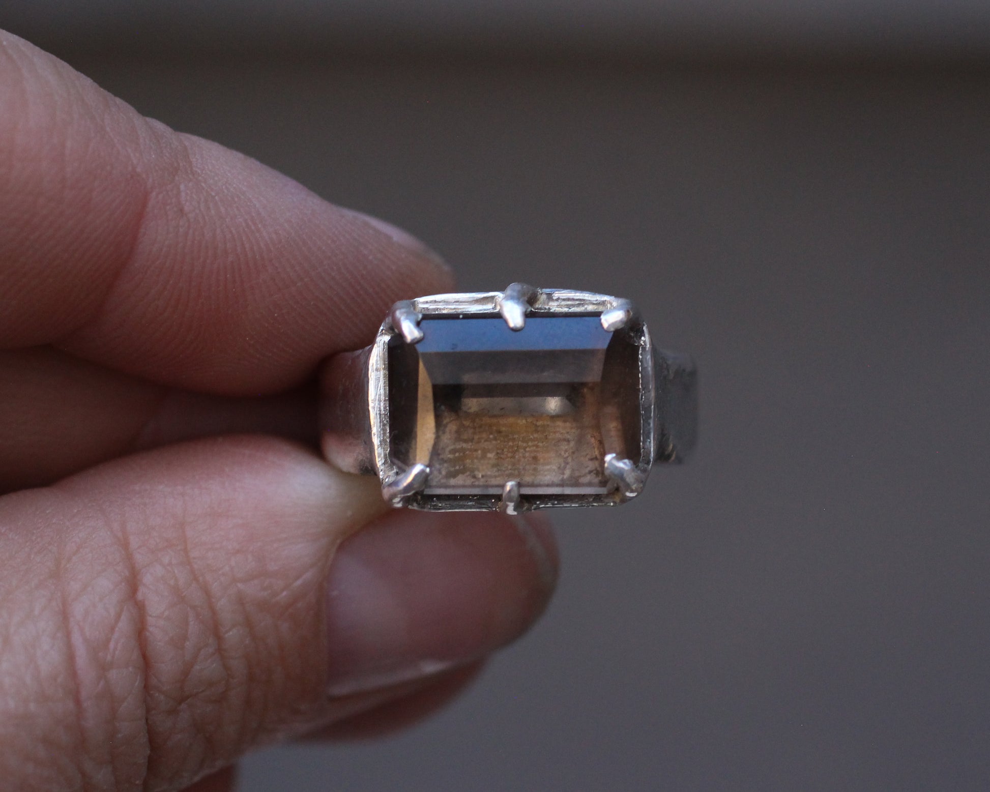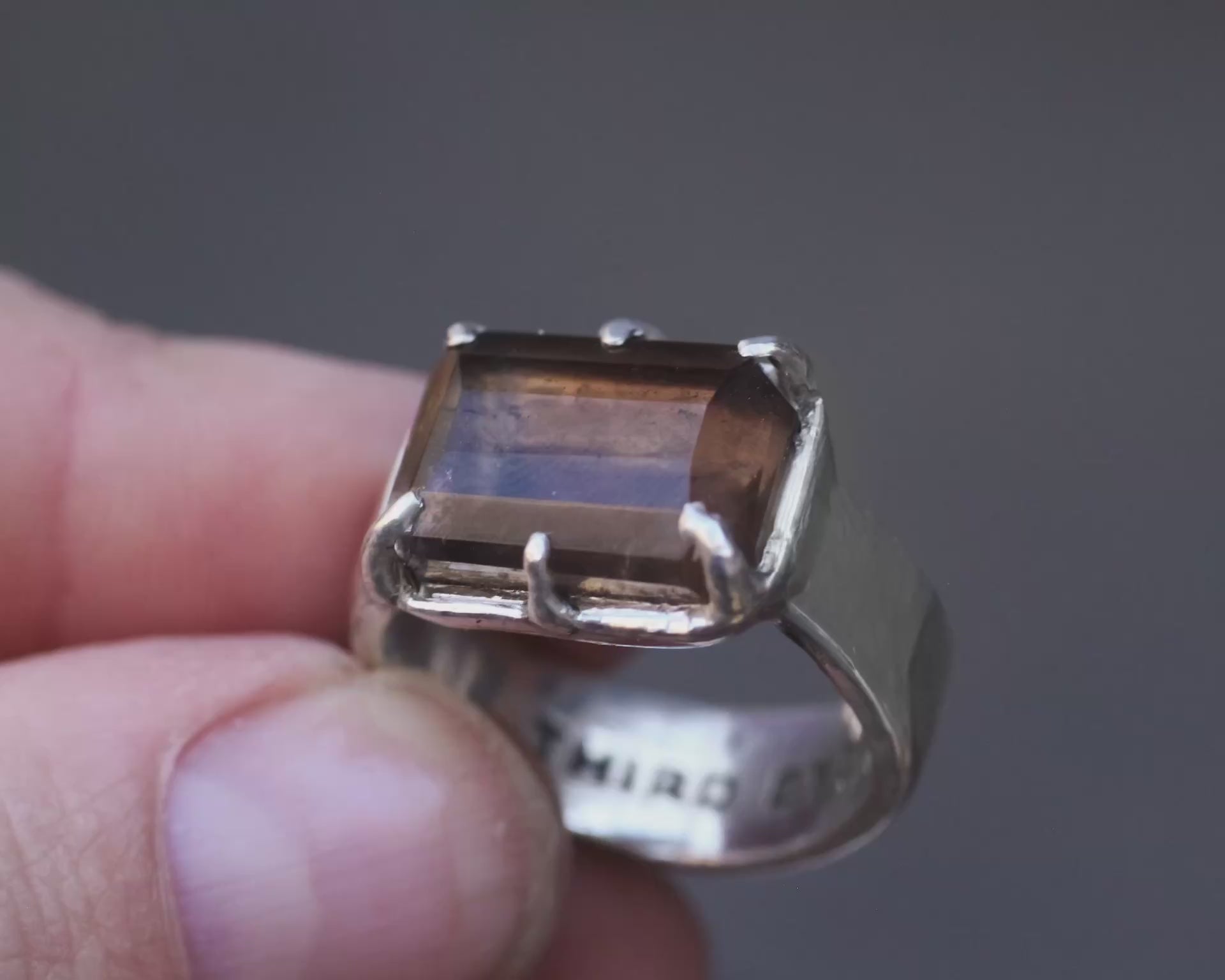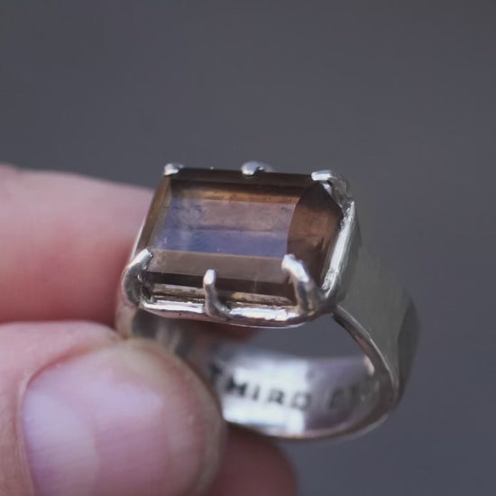 Hand faceted Smoky Quartz, hidden logo , thick band, Silver ring - Size 7.5