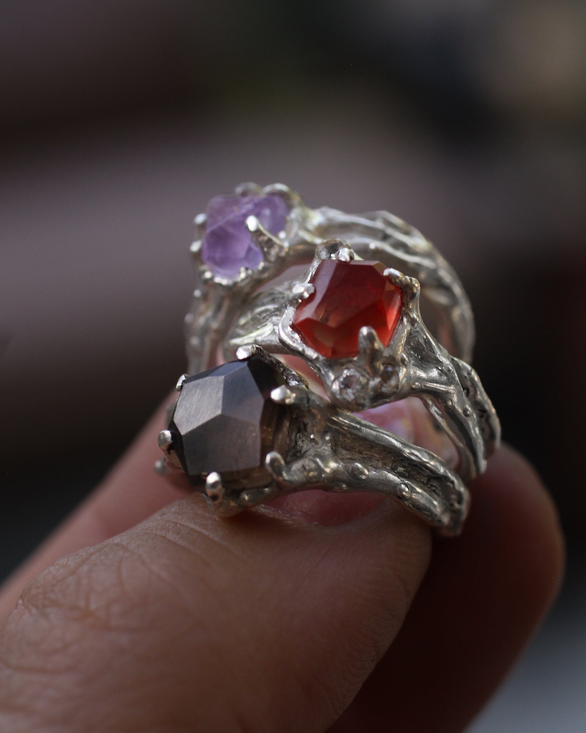 Locally mined Smoky Quartz from the Eastern Sierras, CA - hand faceted and with “rainbow inclusions” when you catch the light. Hand carved and cast in Sterling Silver.
