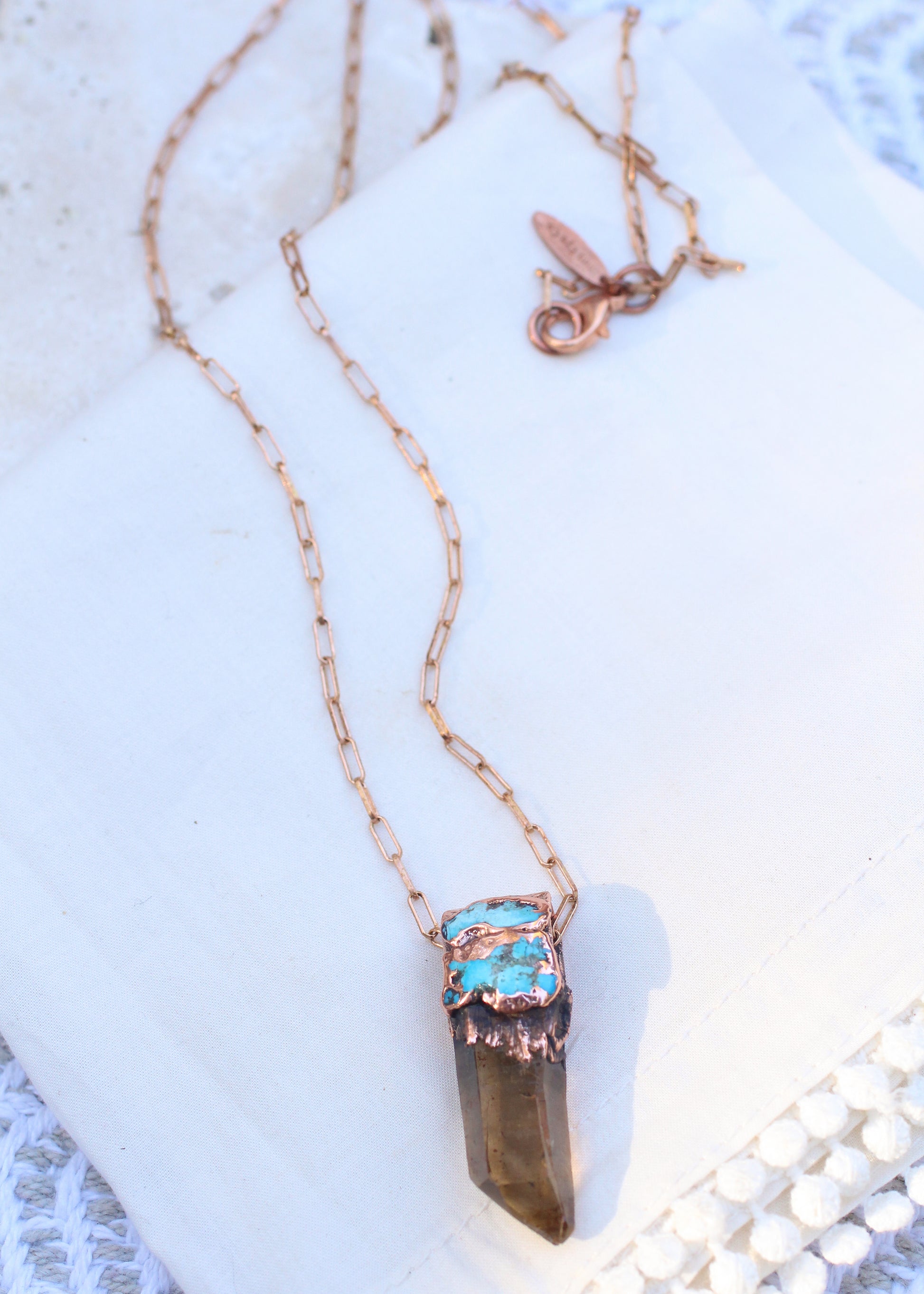 Locally mined Smoky Quartz from the Eastern Sierras, CA paired with inlaid Arizona Turquoise - copper